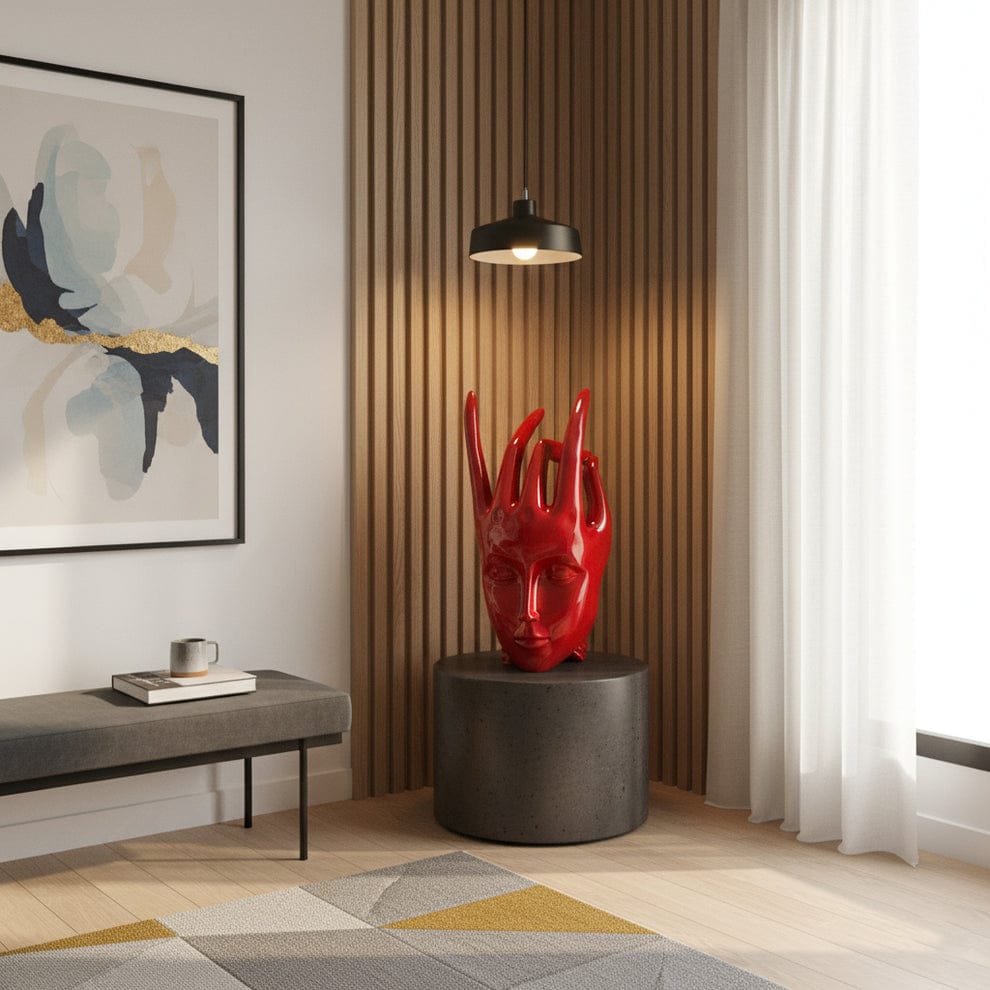 With its serene closed eyes, smooth facial contours, and dramatic crown silhouette, this sculpture instantly becomes the center of attention. The glossy red finish reflects light beautifully, giving your home or office a bold yet peaceful statement.